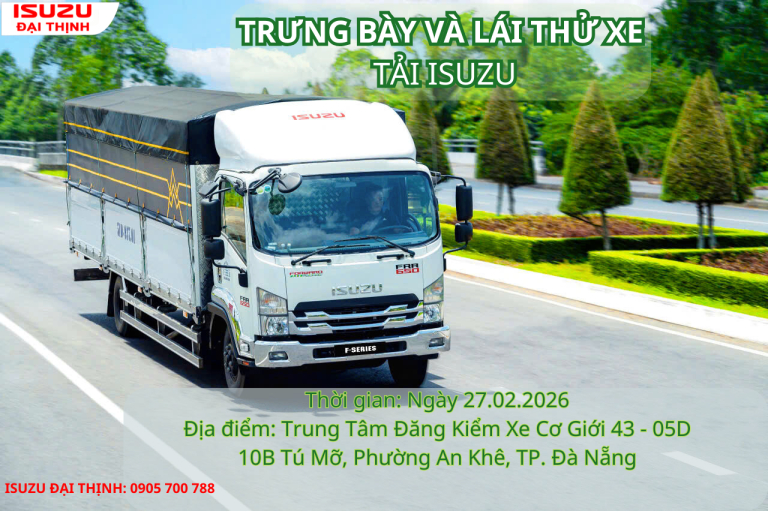 TRƯNG BÀY VÀ LÁI THỬ XE TẢI ISUZU TẠI ĐÀ NẴNG. ⏰ Thời gian: Ngày 27.02.2026 (Thứ Sáu) 📍 Địa điểm: Trung Tâm Đăng Kiểm Xe Cơ Giới 43 - 05D Tú Mỡ. Số 10B, Đường Tú Mỡ, Phường An Khê, TP.Đà Nẵng. 🍂 Isuzu Đại Thịnh tổ chức chương trình “Trưng bày & Lái thử xe” Nhằm giúp Khách hàng có được trải nghiệm tốt nhất, thêm tự tin khi rước xế về nhà. 🍂Các hoạt động chính của chương trình: ✅ Tư vấn kỹ thuật cho Quý khách hàng ✅ Lái thử và trải nghiệm xe…